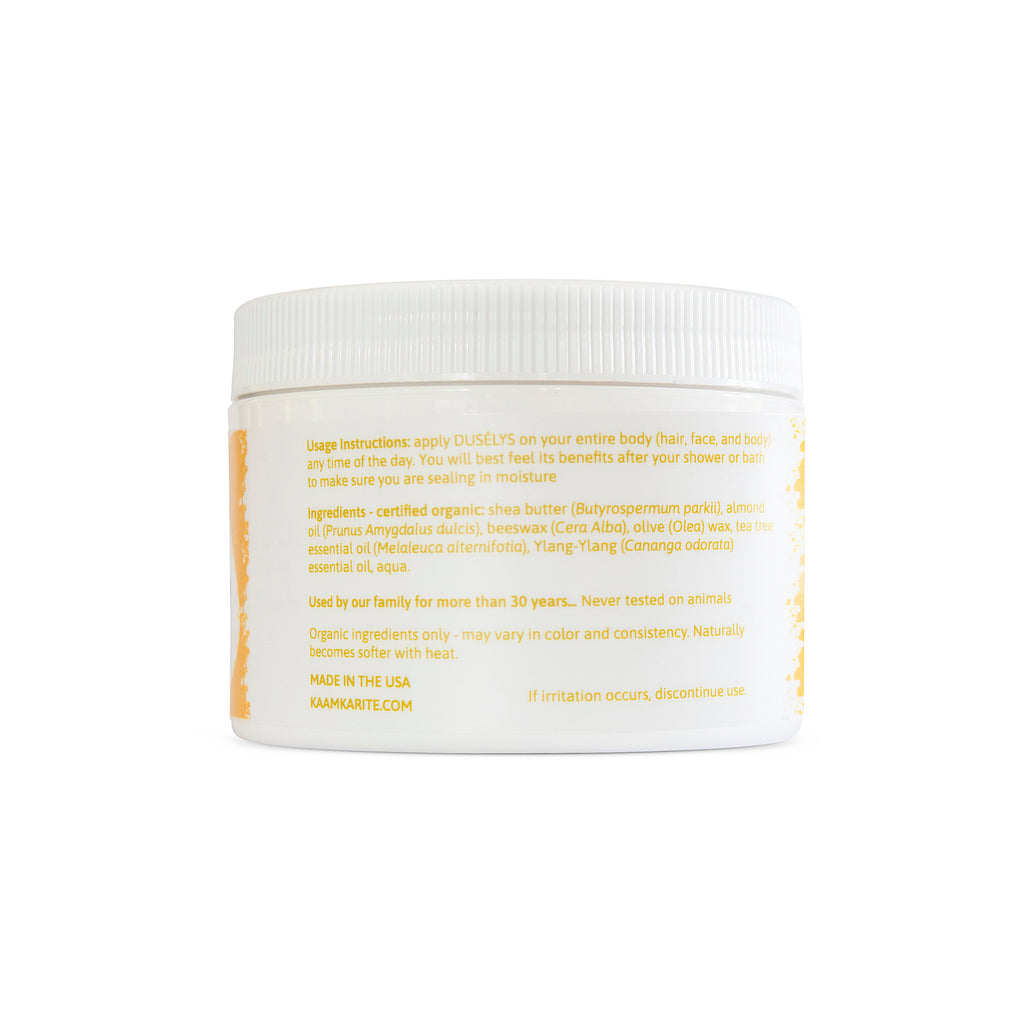 You can use DUSÉLYS body butter at any time of day or night. But the best way is to apply it after your shower or bath to make sure you are sealing in moisture. Apply DUSÉLYS body butter all over body. Pay special attention to areas that are more prone to dryness including elbows, knees, hands, and feet.